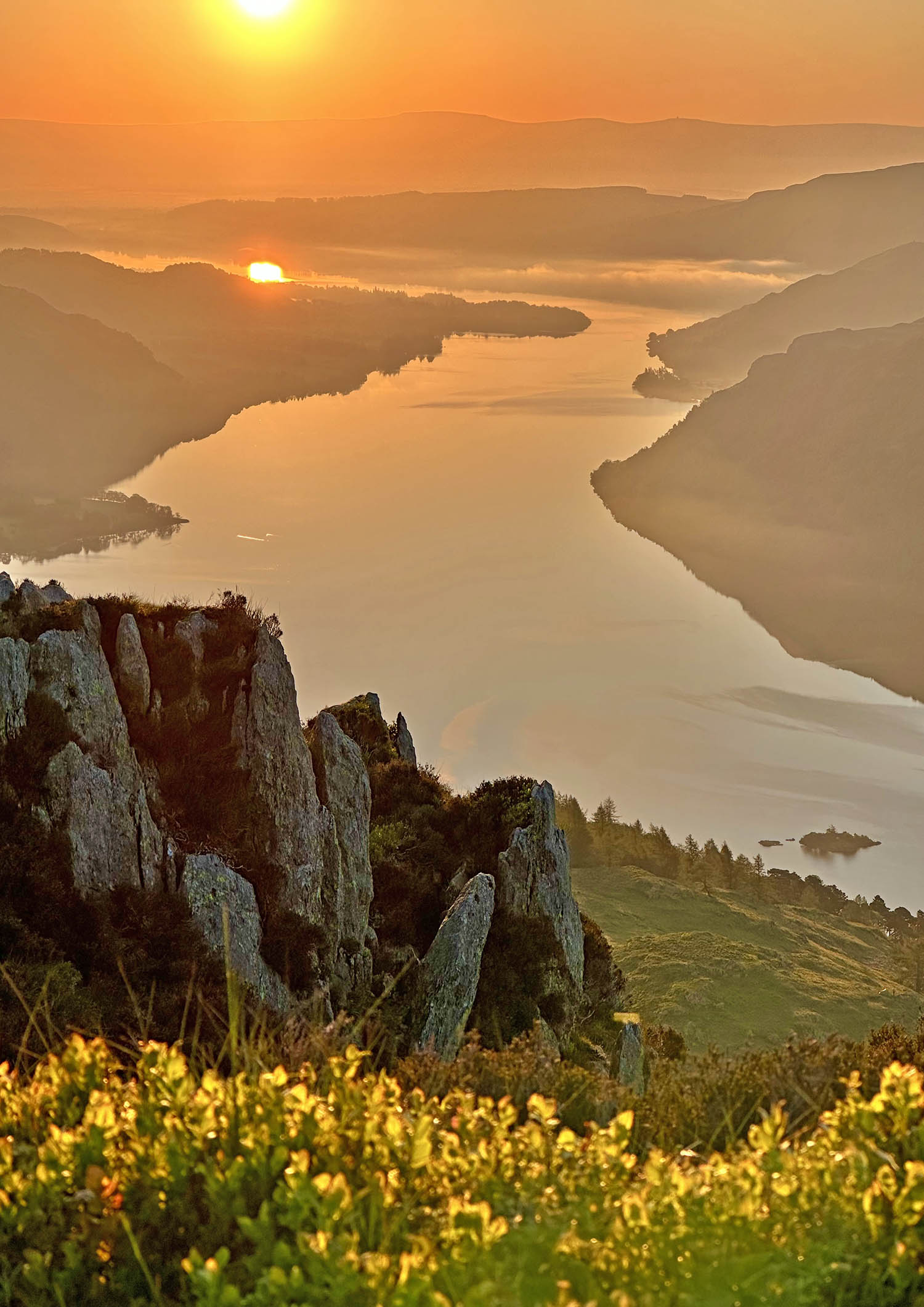 From the heights of Heron Pike, the sunrise over Ullswater unfolds in a breathtaking display of golden-orange light. The first rays spill across the fells, igniting the landscape in warm tones as mist drifts gently over the lake below. The still water mirrors the glow of the sky, creating a perfect harmony between earth and light. It’s a moment of quiet wonder — when the world feels fresh and alive, and the beauty of the Lake District reveals itself in its most radiant form.